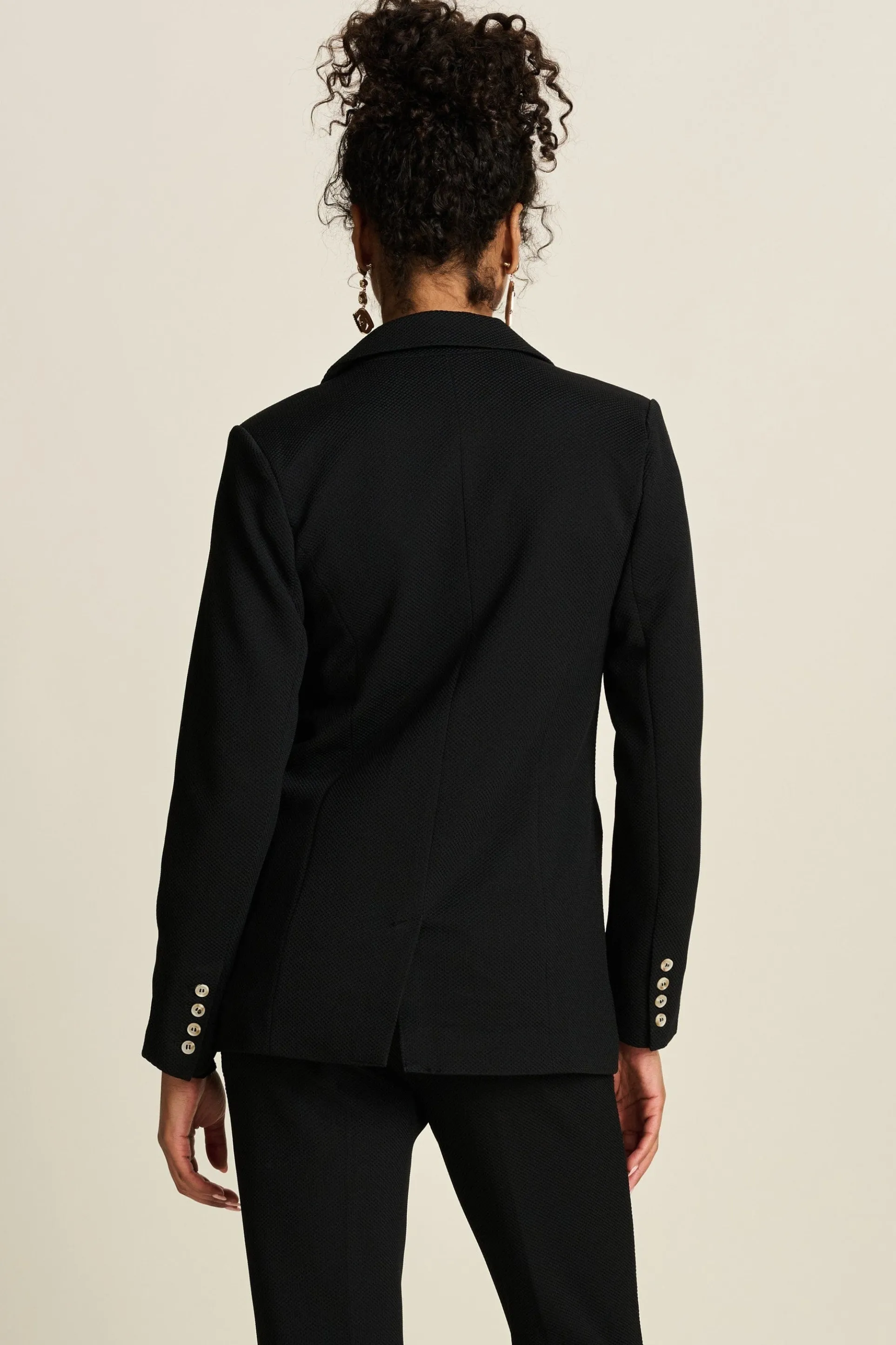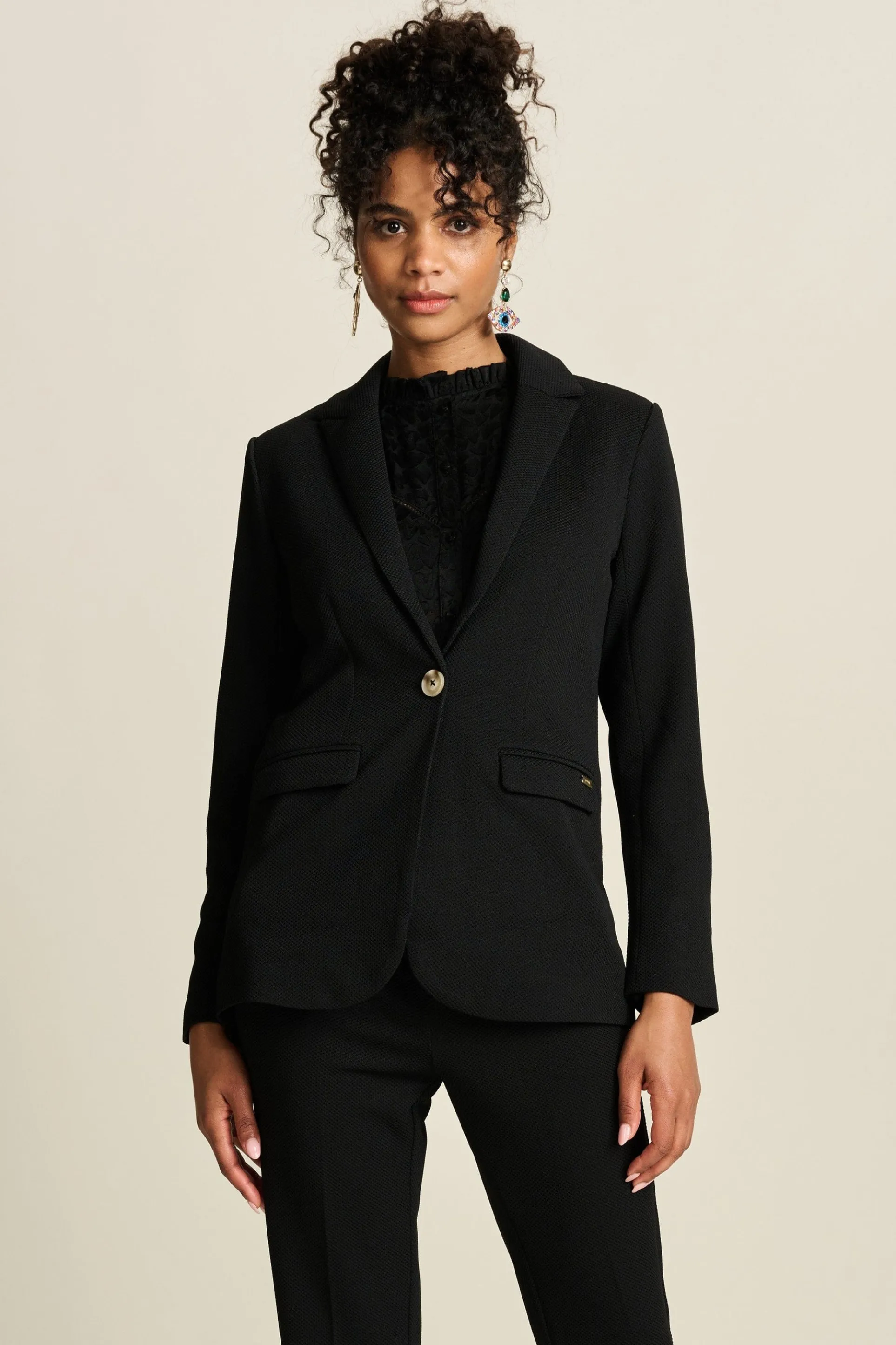 Deze zwarte blazer heeft een subtiele wafelstructuur in de stof en een voering met hartenprint. De blazer heeft steekzakken, een bruine knopensluiting en een kraag. Combineer de blazer met onze ‘Liv Black’ pantalon en een paar toffe sneakers en straal in dit tijdloze pak.