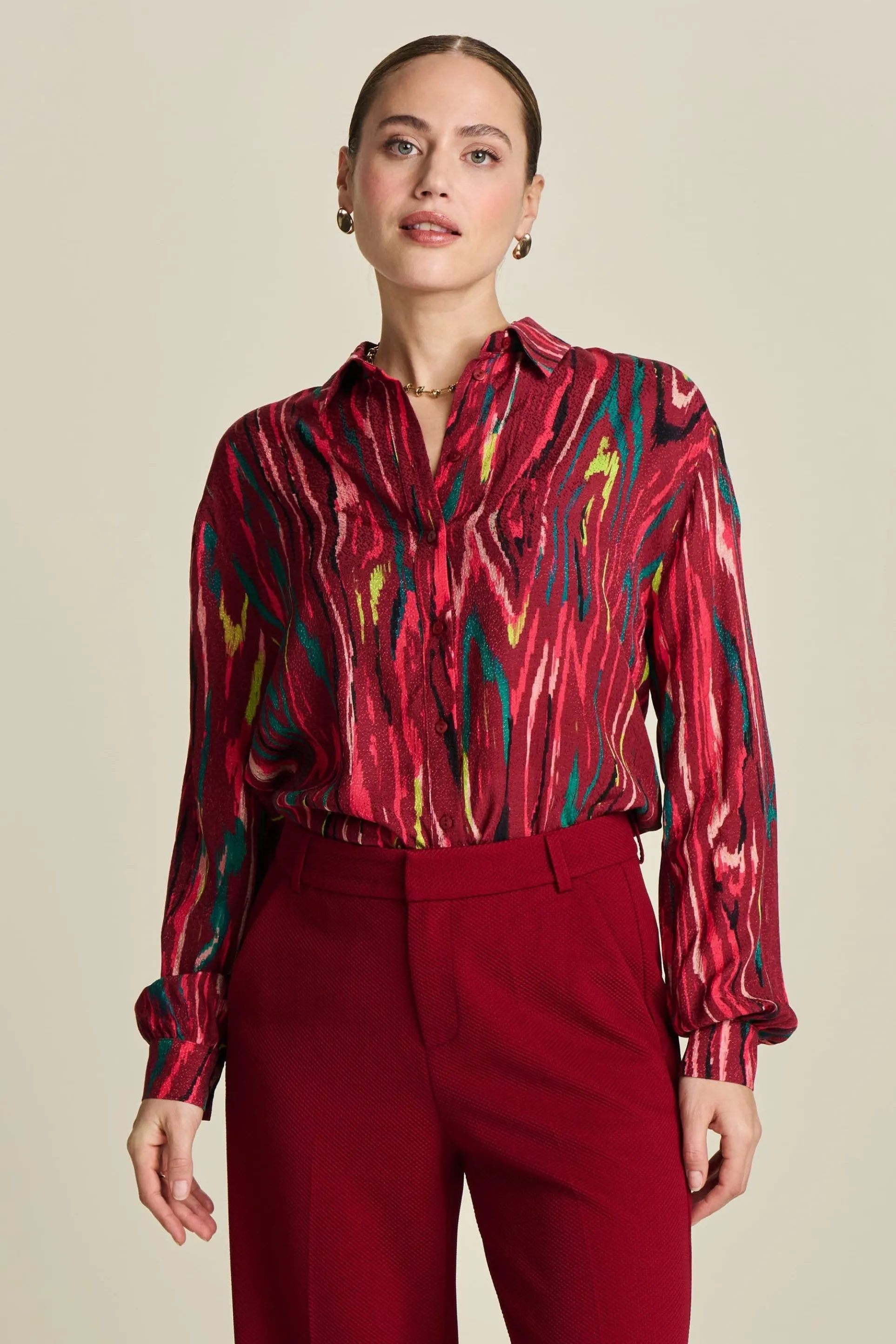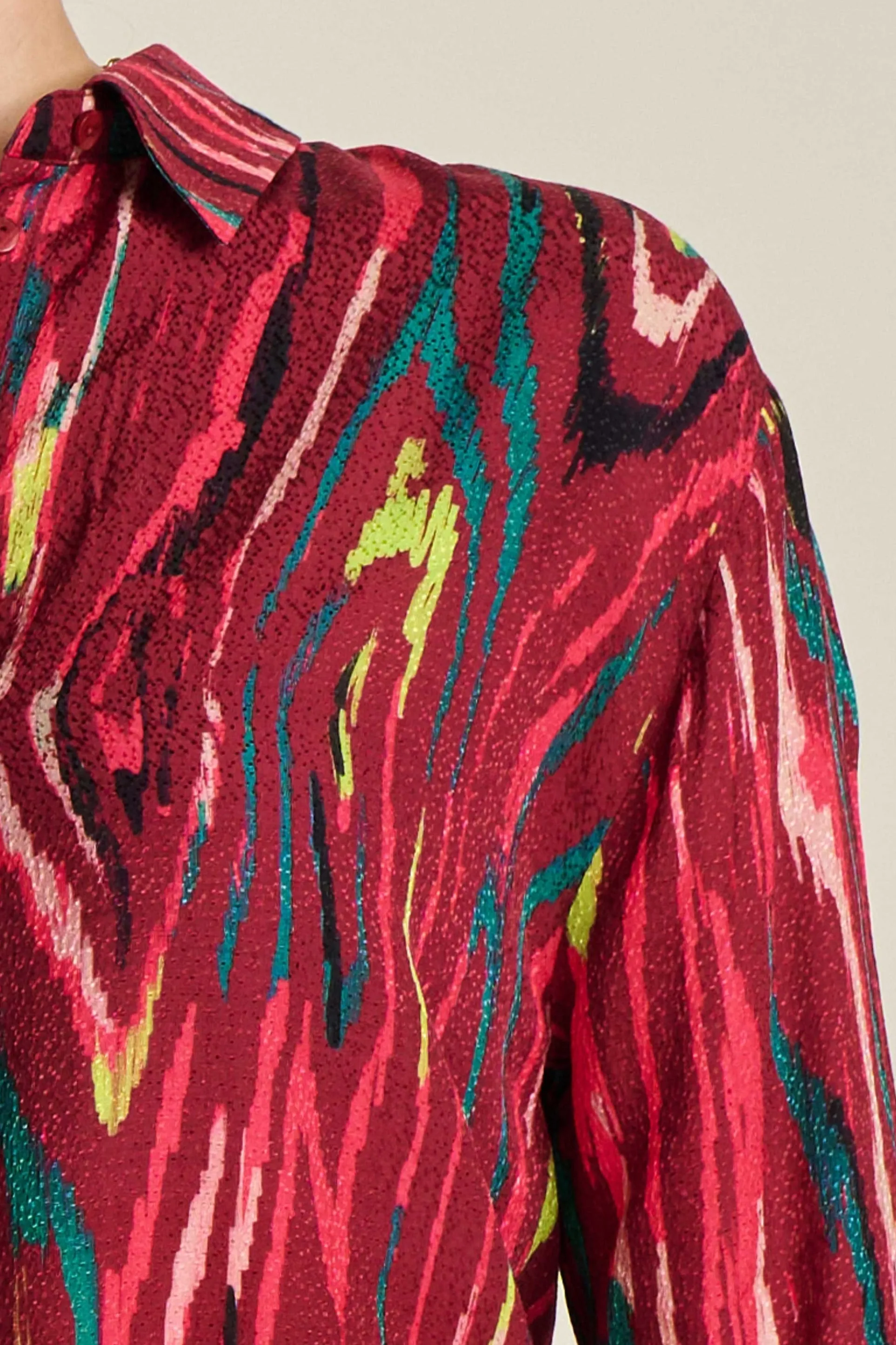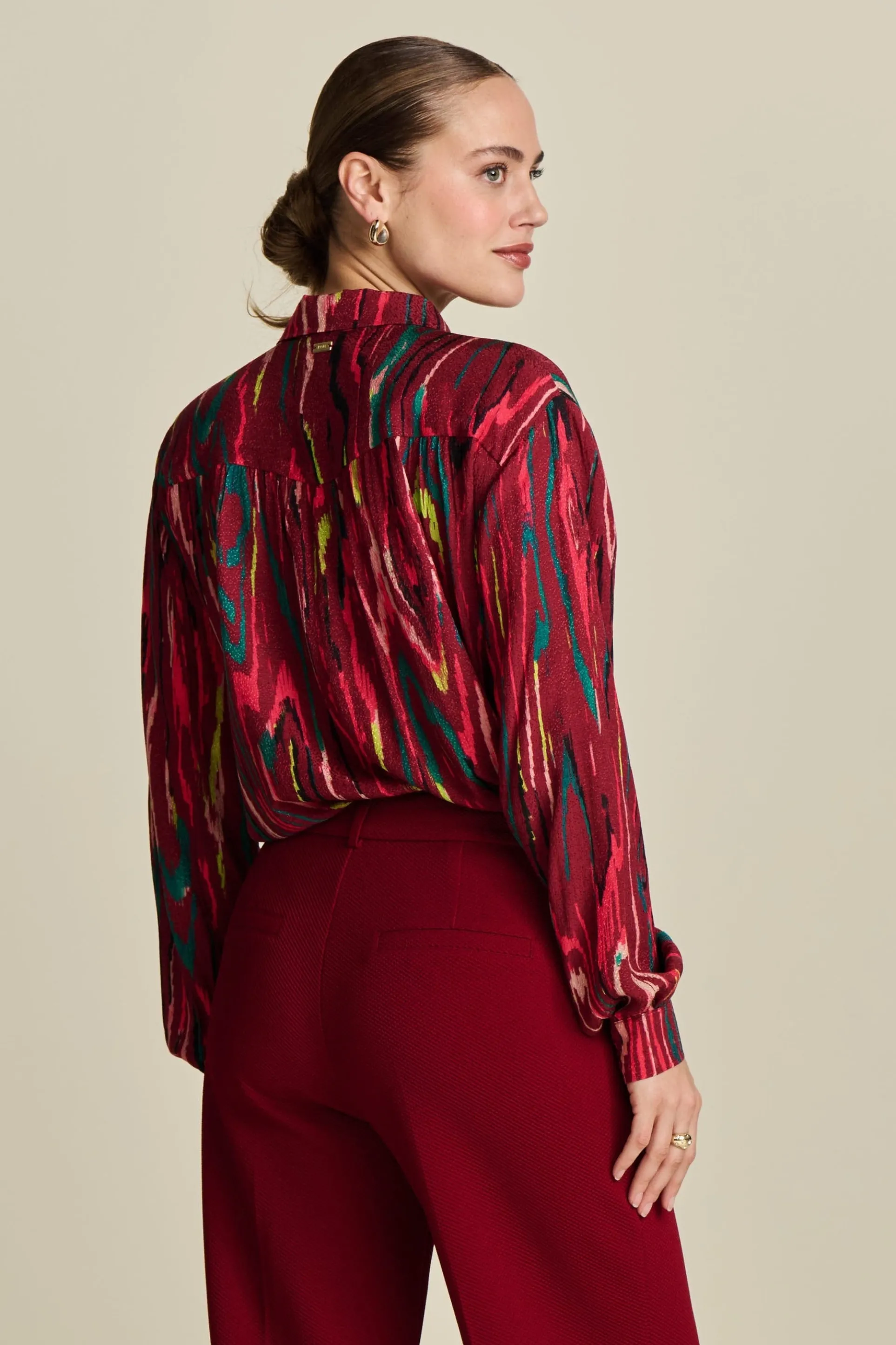 Deze rode blouse heeft een kleurrijke camouflageprint. Voor deze print is gebruik gemaakt van een speciale waterverf techniek. De stof van de blouse gemaakt van LENZING ™ ECOVERO ™, waardoor dit item ‘more sustainable’ is.