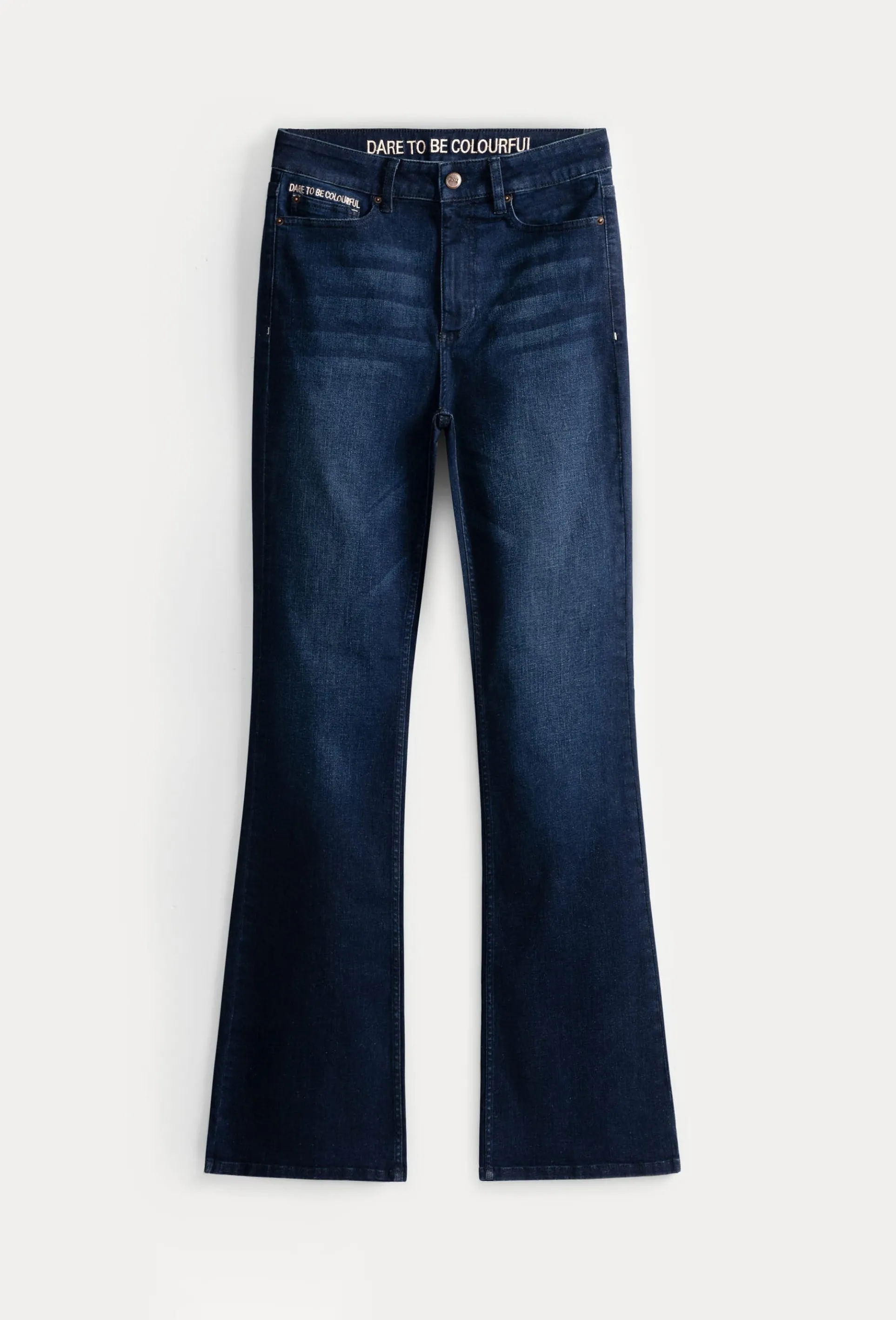 Je kunt nooit genoeg jeans hebben. De ‘Esmee Flare Dark Blue’ jeans is donkerblauw en heeft licht uitlopende pijpen. De broek heeft vijf zakken. Leuke details zijn het geborduurde ‘dare to be colourful’ op de zak en de zakvoering, die typisch Amsterdamse huizen laat zien. Ook aan de binnenkant van de broek zijn de woorden ‘Dare to be colourful’ geborduurd.