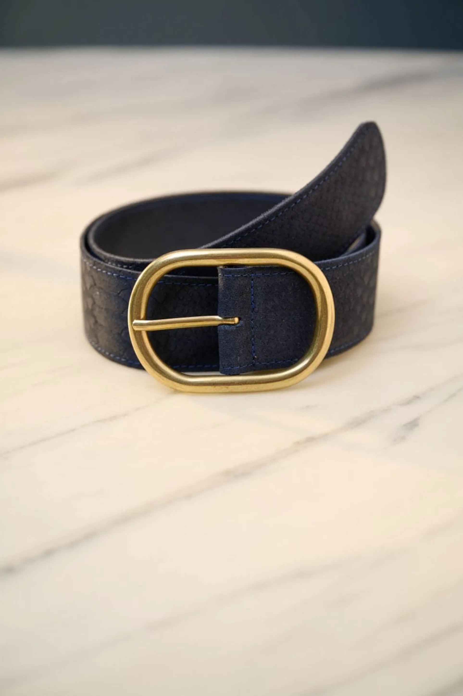Een klassieke suède marineblauwe riem om je outfit te stylen! De riem heeft een slangenstructuur en wordt geleverd met een gouden gesp met afgeronde hoeken. Deze duurzame riem wordt in Nederland geproduceerd.