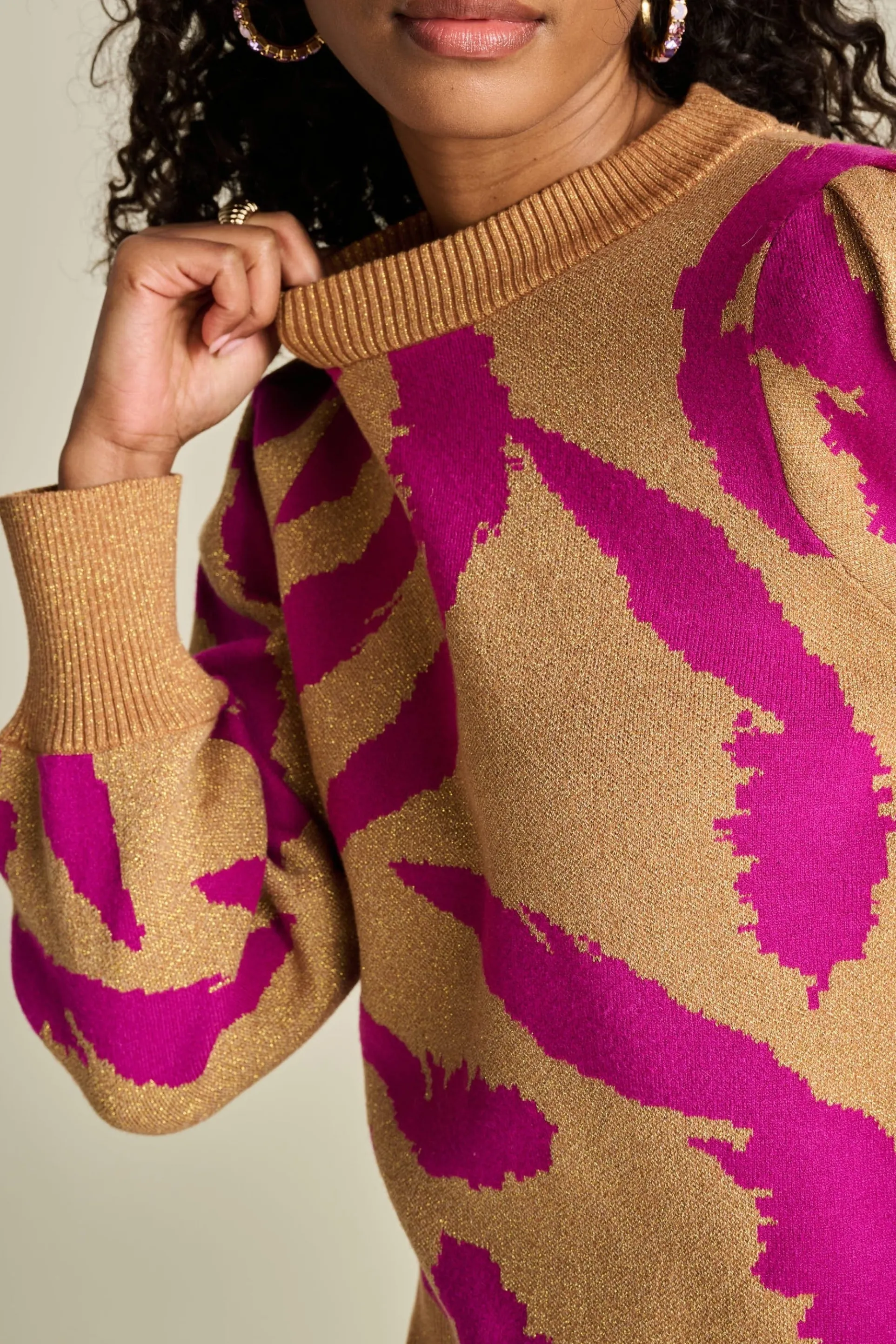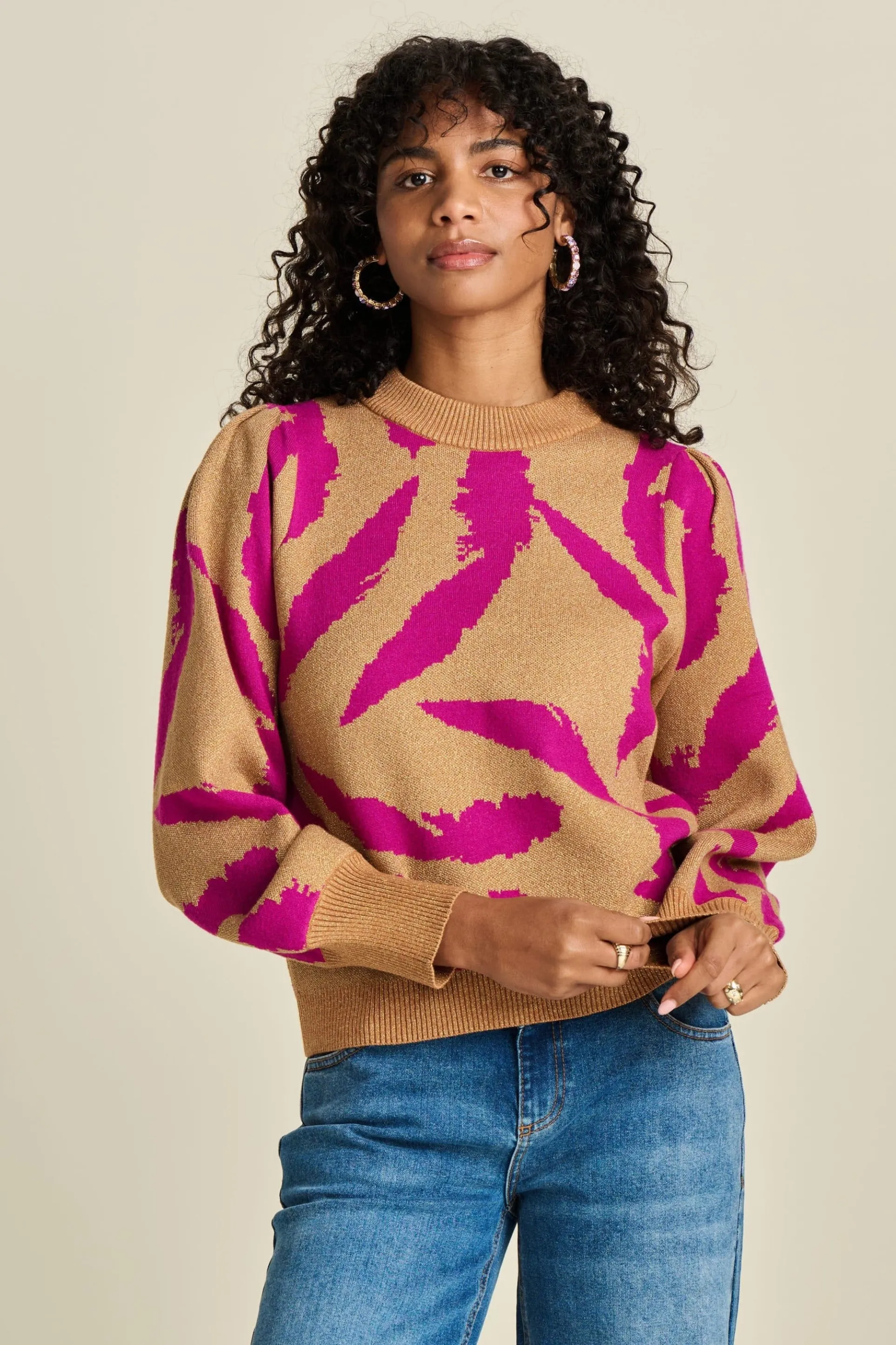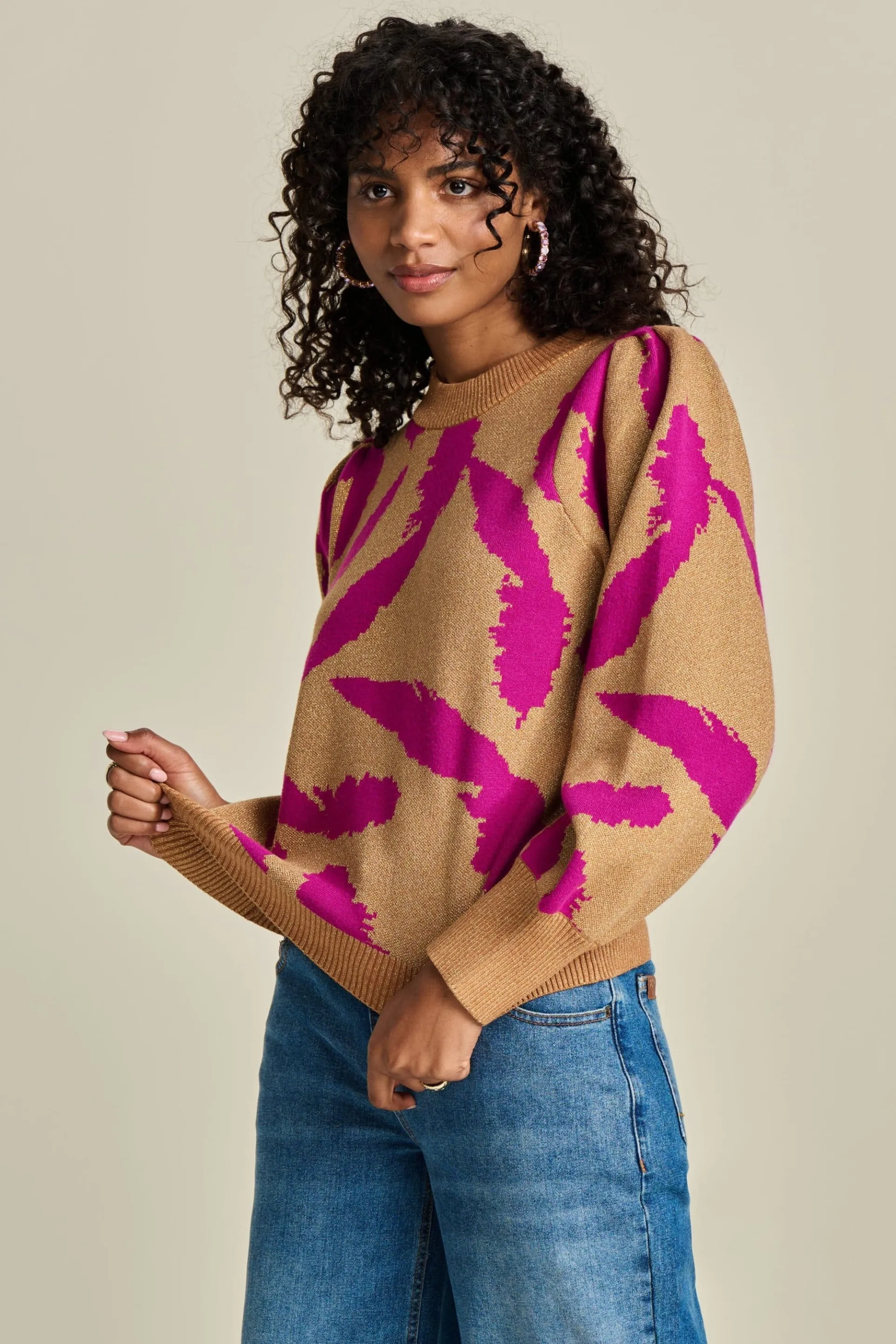Ontdek deze bruine trui met een patroon van roze veren geïnspireerd op vleugels van vogels. Door de stof zit een subtiele sparkle geweven. De trui is gemaakt van een zachte stof, waardoor dit item zeer comfortabel is.